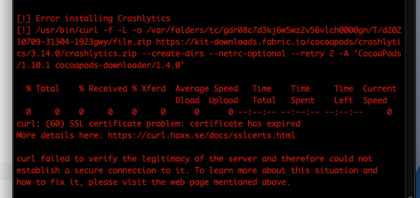 I get this error while I try to install a podfile which has crashlytics in it as well: Installing Crashlytics (3.3.1) [!] Error installing Crashlytics [!] /Applications/XAMPP/xamppfiles/bin/curl ...