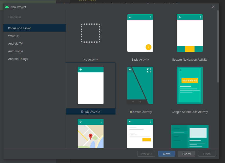 안드로이드 스튜디오에서 안드로이드 프로젝트를 새로 생성해주었습니다.