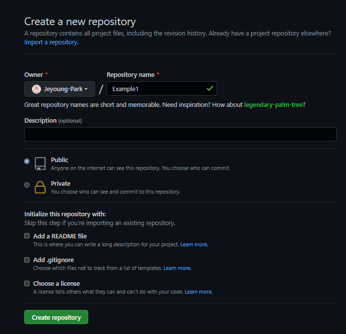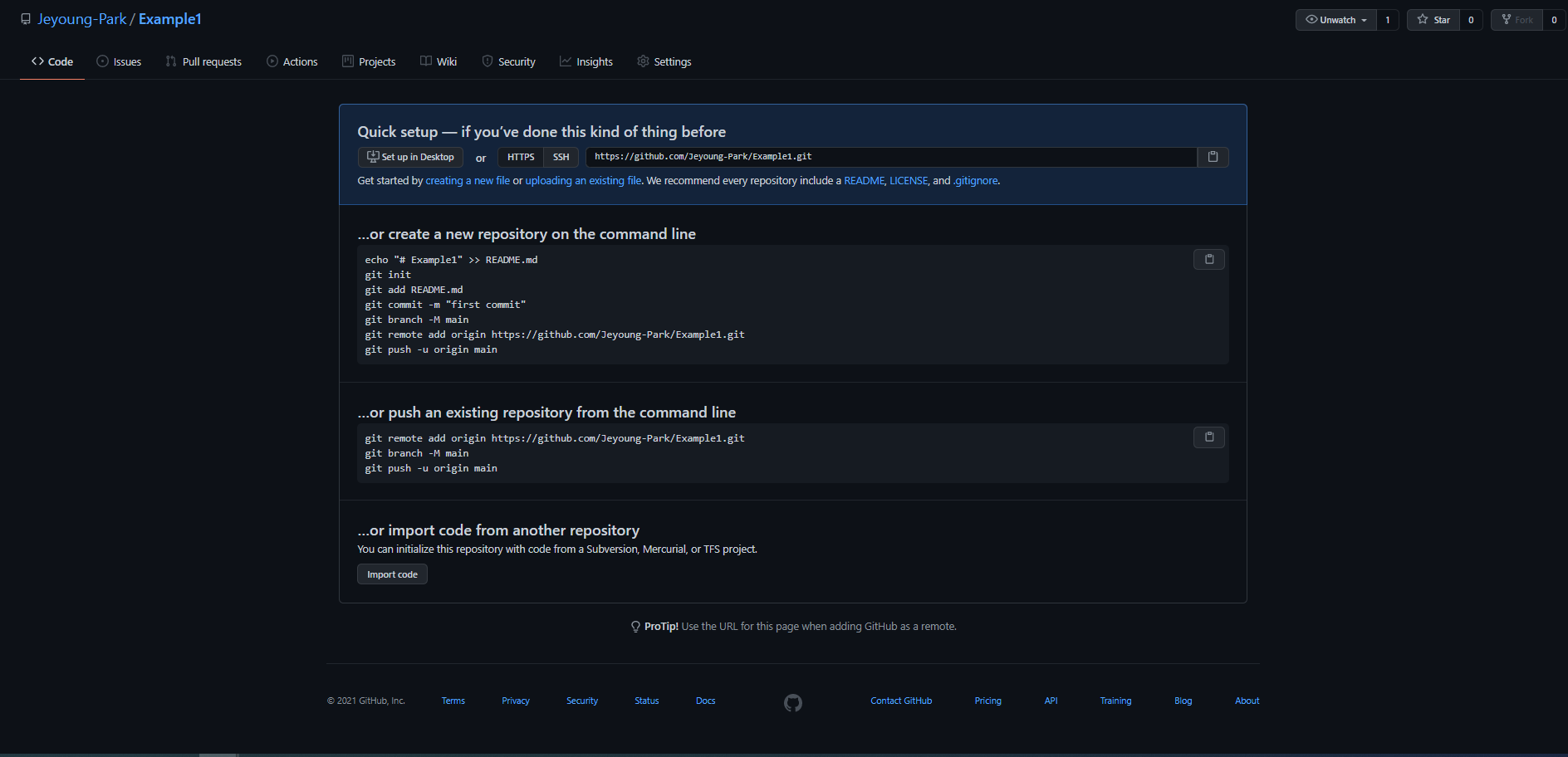 git remote add origin https://github.com/Jeyoung-Park/Example1.git //github repository와 프로젝트의 주소를 연결해줍니다.