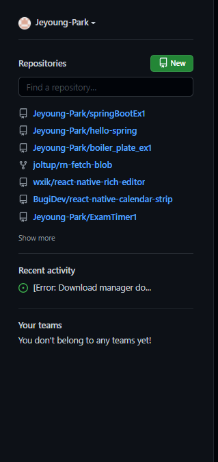먼저 github 홈페이지 좌측에서 New 버튼을 클릭해 repository를 생성해줍니다.