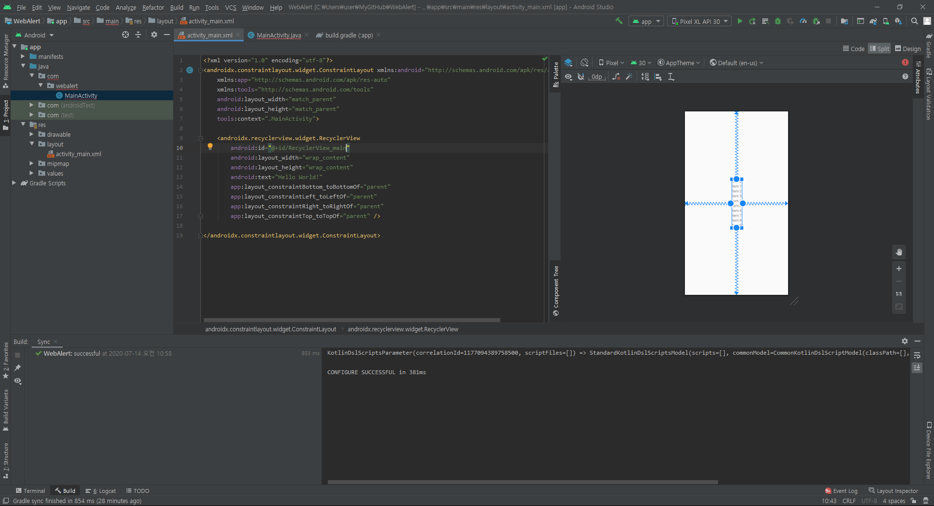 이렇게 작성을 해주시면 리사이클러뷰를 사용하기 위한 기본적인 요소들은 모두 갖추었습니다.