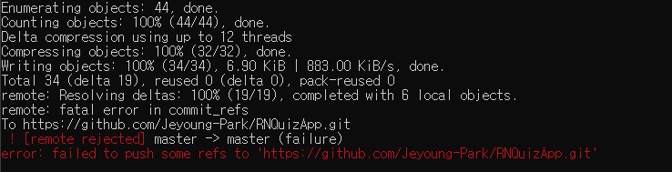현재 작업 중인 게시물을 깃허브에 올리려고 평소와 다름없이 push 명령어를 입력해주었는데요, 푸시에 실패하였다는 메시지를 받았습니다.