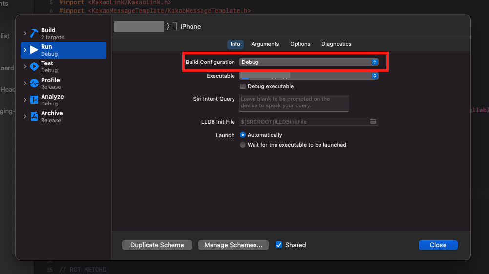 xcode에 들어가 edit scheme 버튼을 누르면 다음과 같은 창이 뜨는데요,