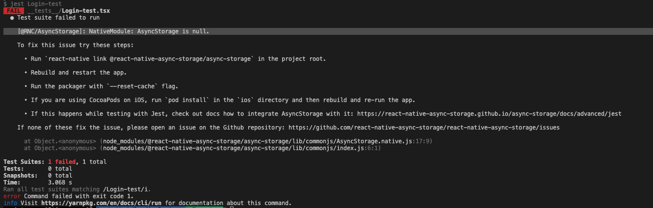 루트 폴더에 __mocks__/@react-native-async-storage/async-storage.js 폴더 및 파일을 생성하고 해당 파일 내에 아래 문장을 추가해주면 됩니다.