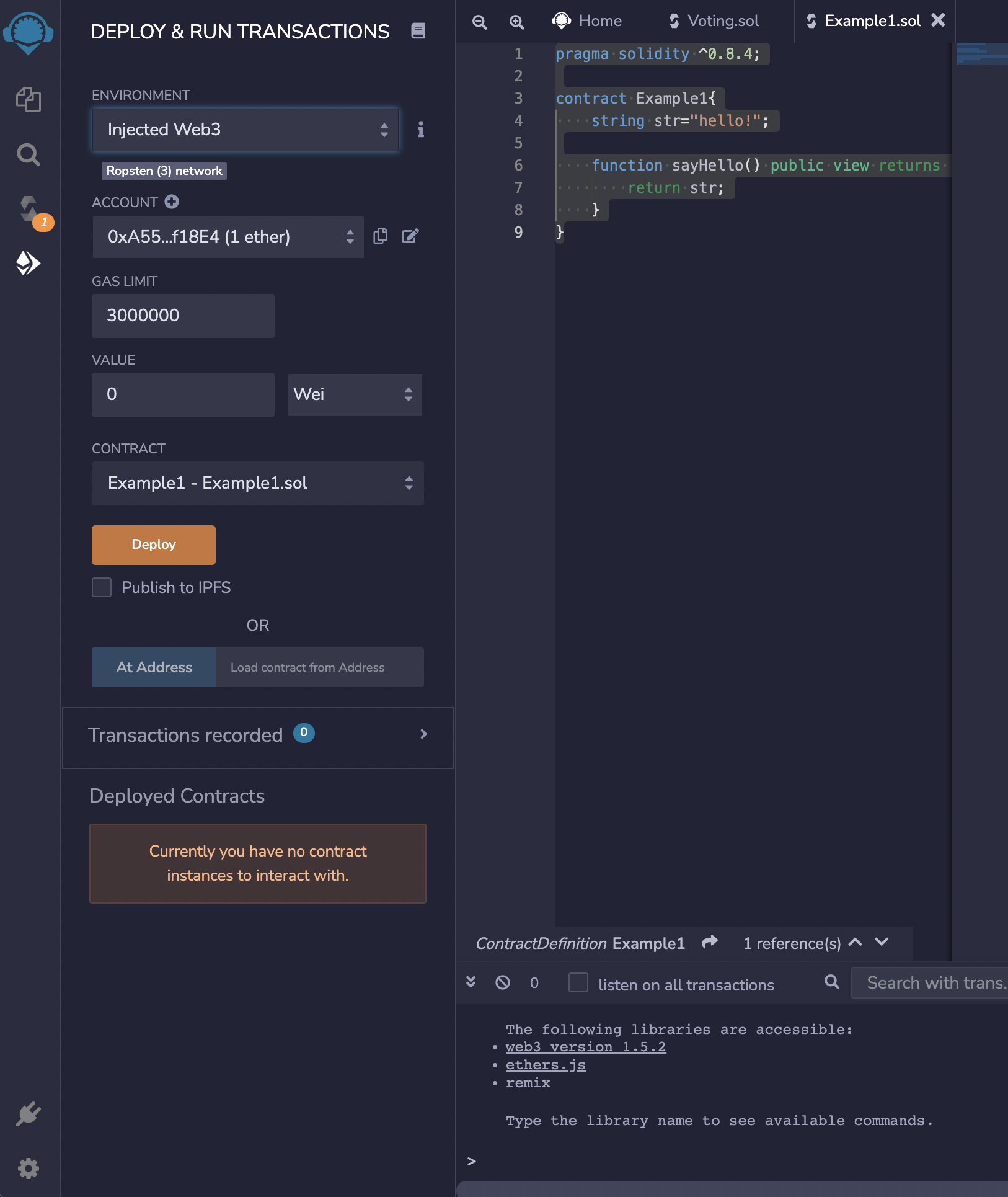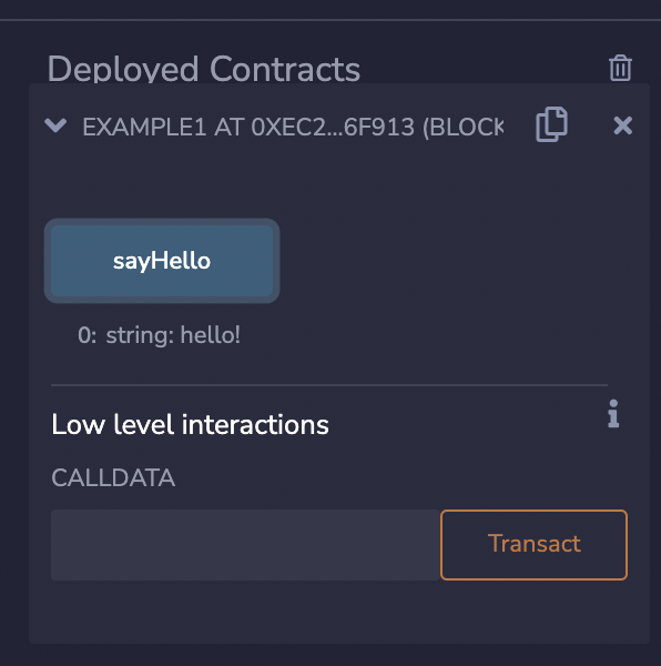 배포가 성공하면 좌측하단에 deployed contracts에 배포된 스마트 컨트랙트가 생기게 됩니다.