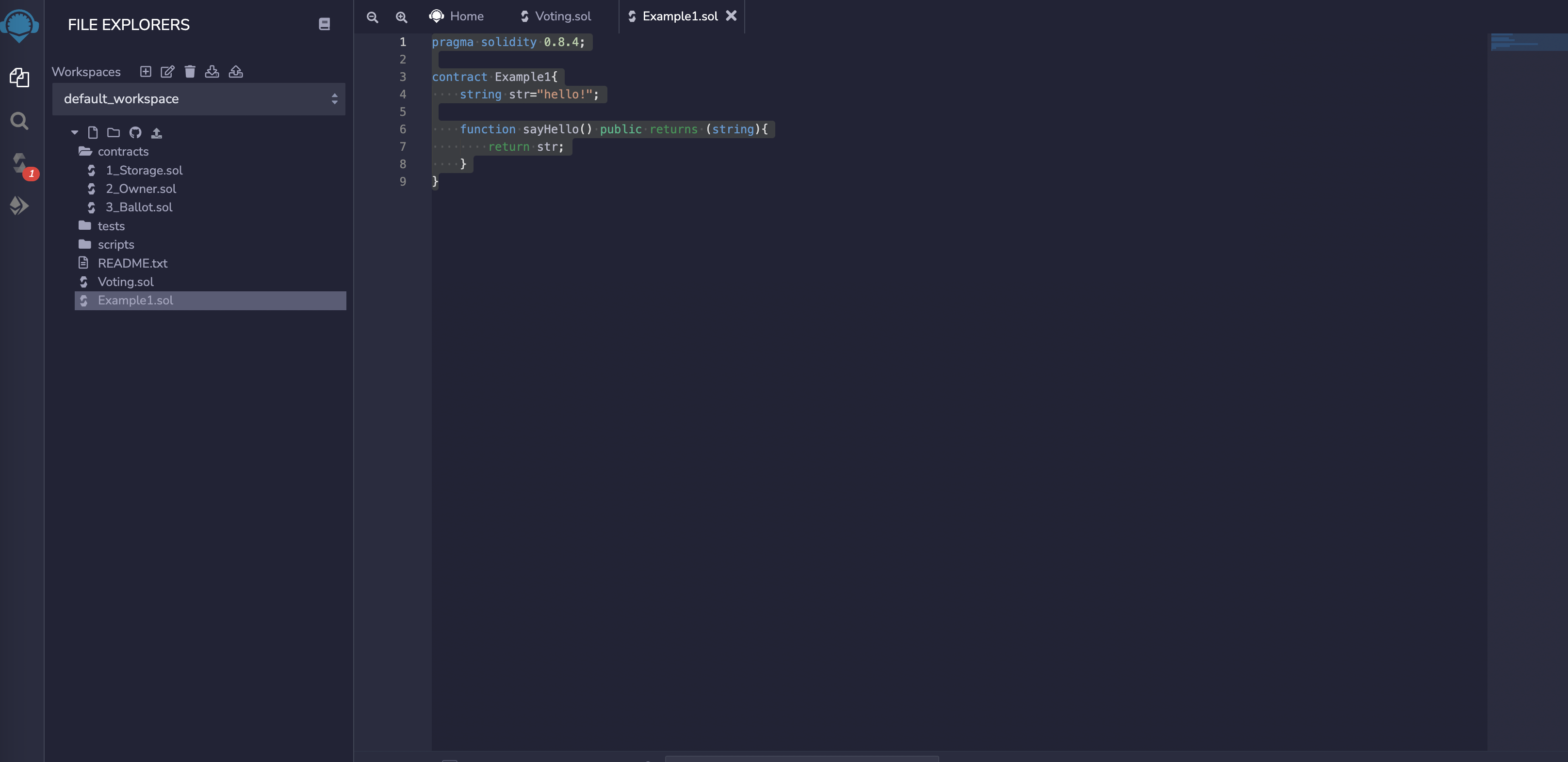 Example1.sol이란 파일을 생성하고 아래 코드를 작성하여 집어넣어줬습니다.