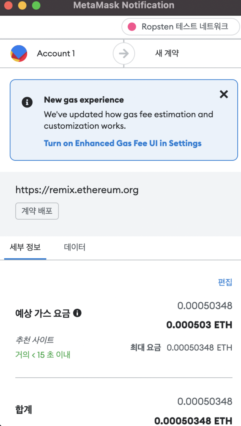 주황색 deploy 버튼을 누르게 되면 metamask extension이 열리게 되고 가스 요금 확인을 하게 되면 배포가 진행됩니다.