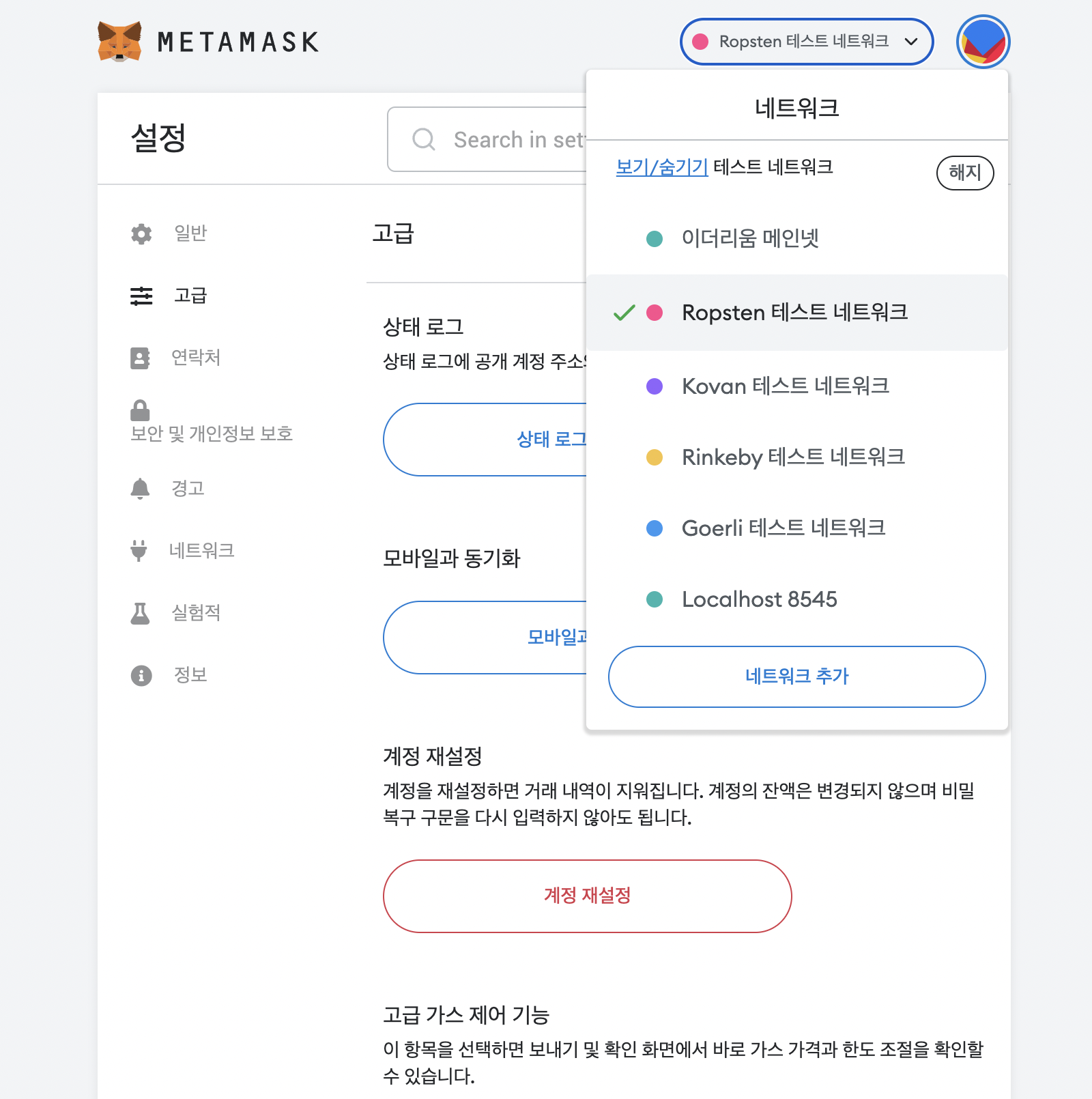 1. 메타마스크에 들어가서 네트워크를 Ropsten 테스트 네트워크로 바꿔줍니다.